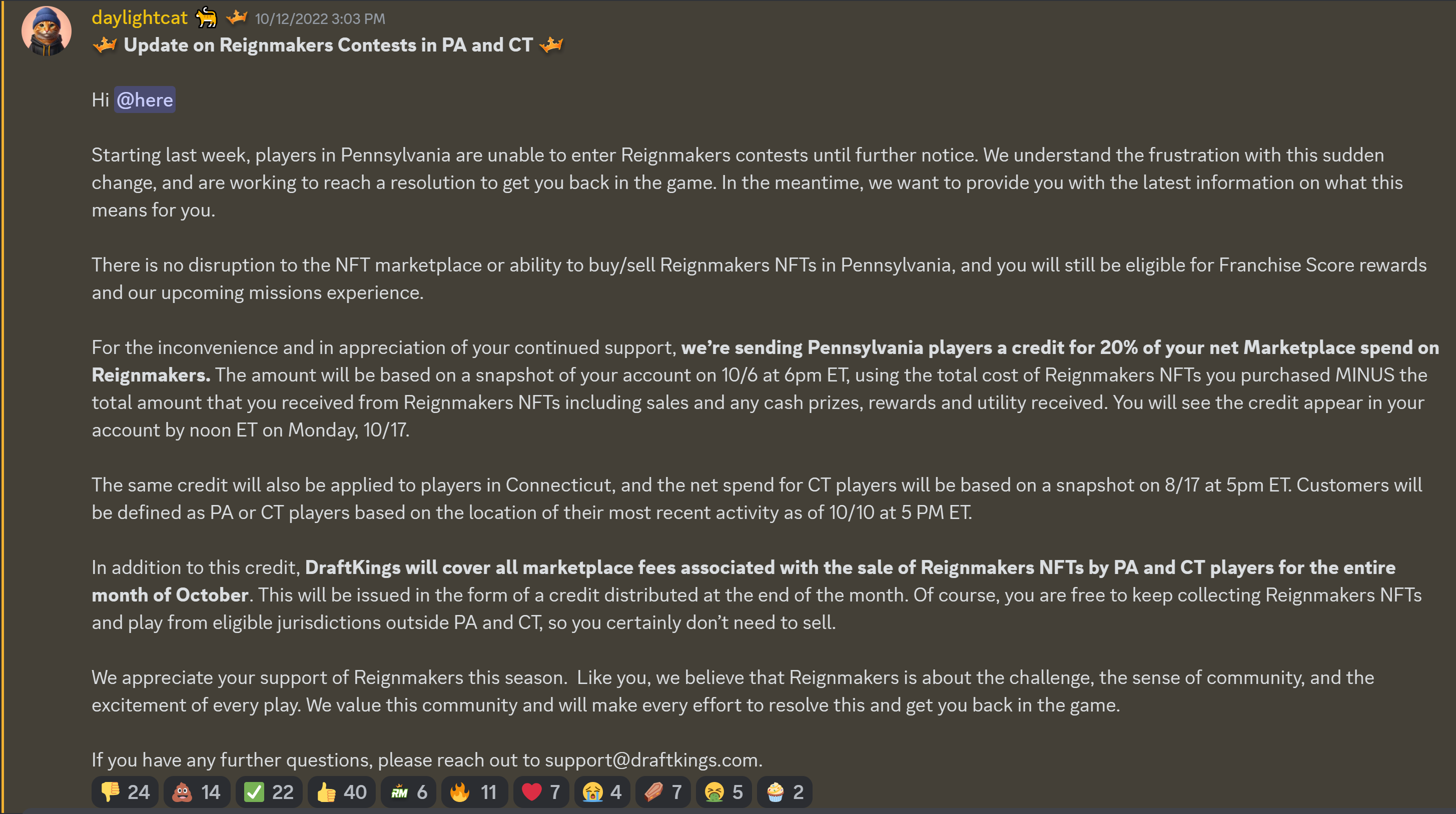 Within a few days, Draftkings announced via their discord channel that all affected customers would receive 20% of their net marketplace spend as a make good, and would also be allowed to sell their holdings at market value without any marketplace fees. This make good was also applied to CT residents who had similarly been affected.